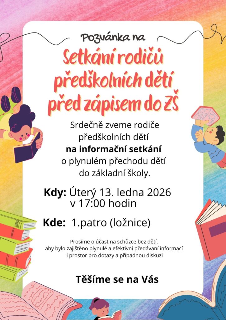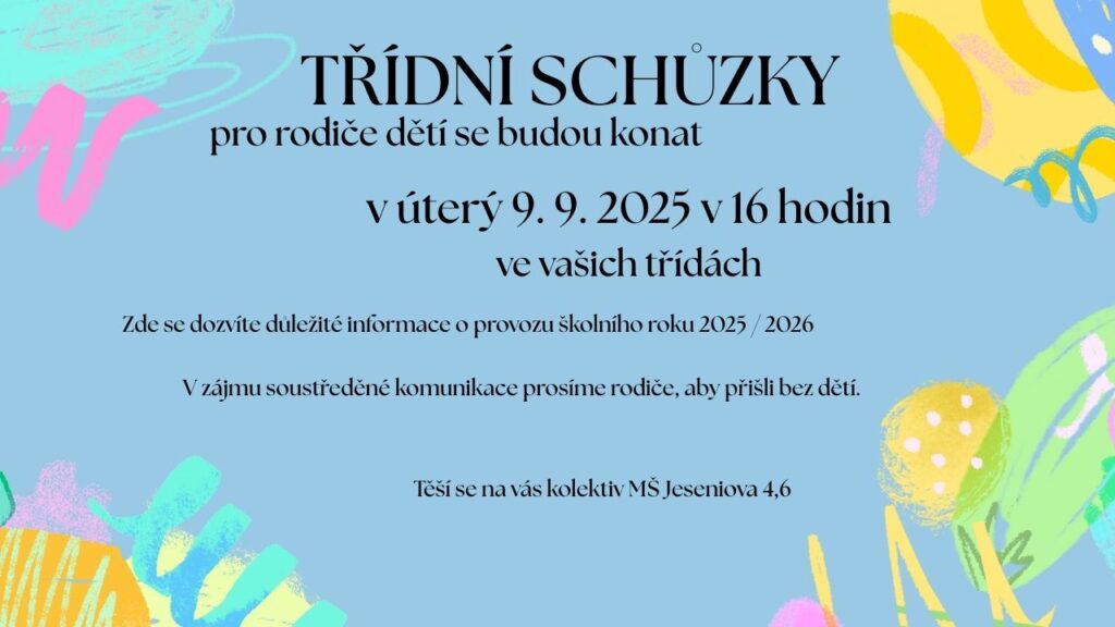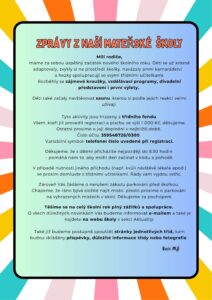 Další podrobné informace a odkazy k přihlašování budou včas zveřejněny na webových stránkách MČ Praha 3 (www.praha3.cz), prostřednictvím webových stránek naší MŠ (www.msjeseniova4.cz), na nástěnkách a mailem.