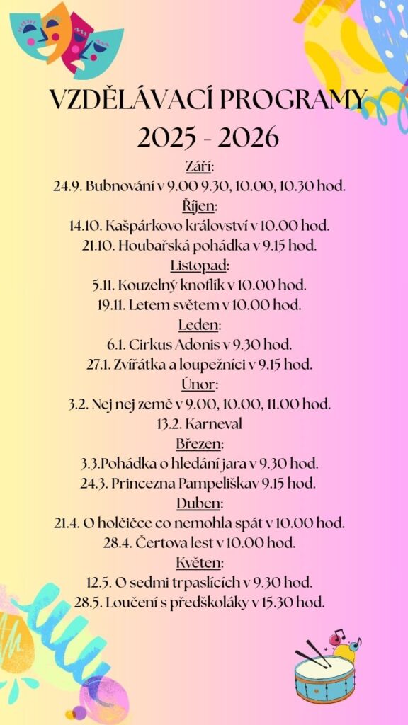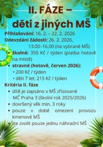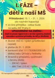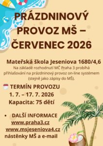 Naše mateřská škola bude v době letních prázdnin v provozu od 1. 7. do 17. 7. 2026.
