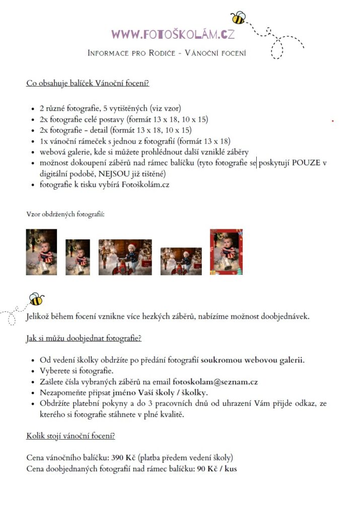 - Úplata za předškolní vzdělávání: 350 Kč / týden (1 týden = 350 Kč, 2 týdny = 700 Kč, 3 týdny = 1.050 Kč)